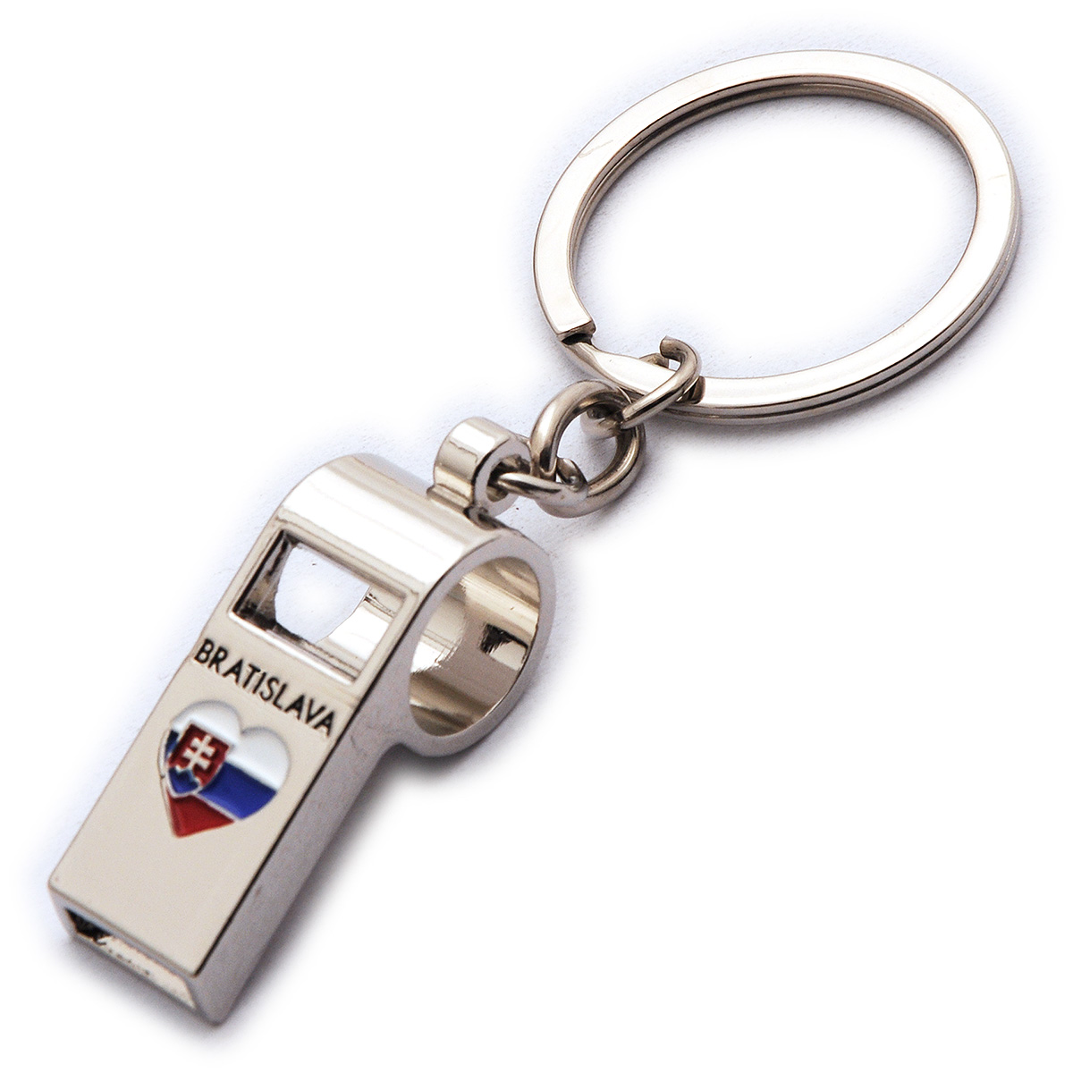 Pevná kovová kľúčenka s píšťalkou.